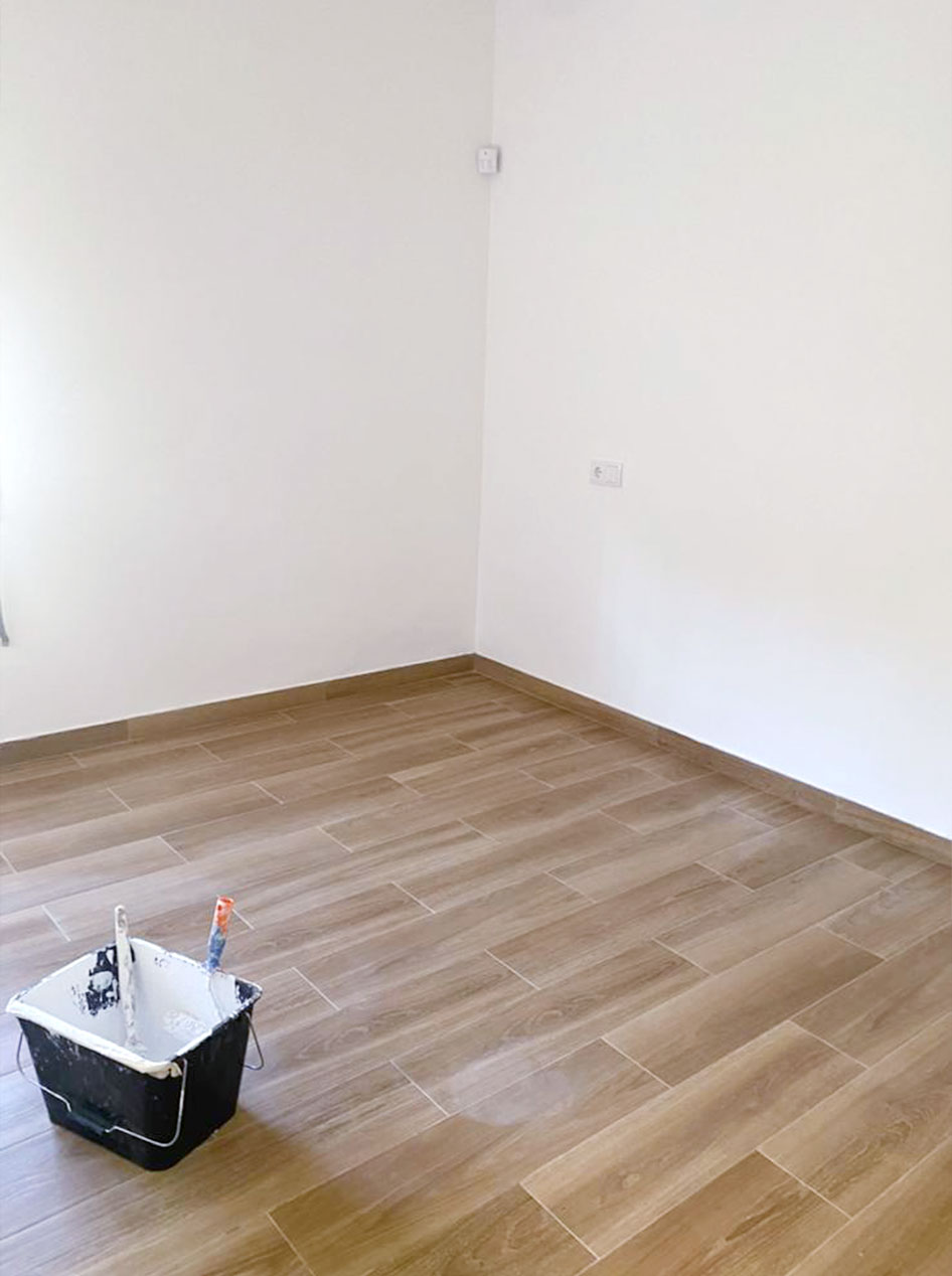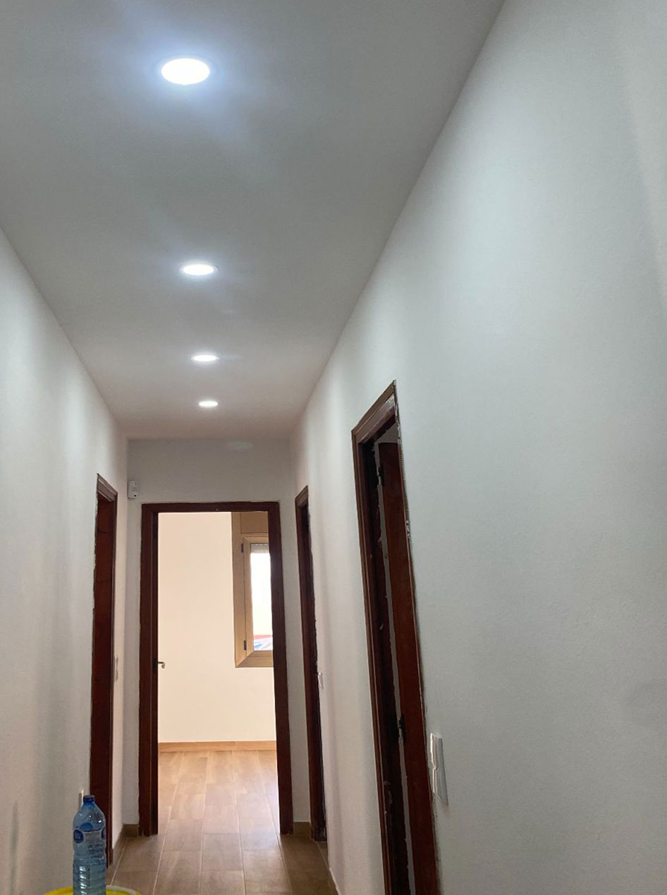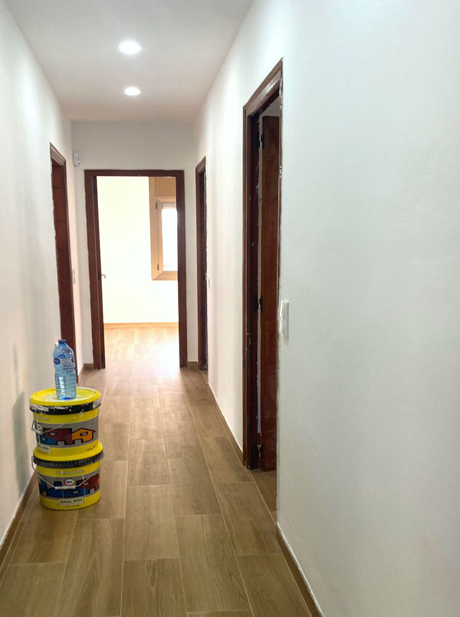- Reparación de paredes y pintura: Corregimos todas las imperfecciones en paredes y techos y pintamos el interior de la vivienda en color blanco, aumentando la sensación de amplitud y luminosidad en todas las estancias.