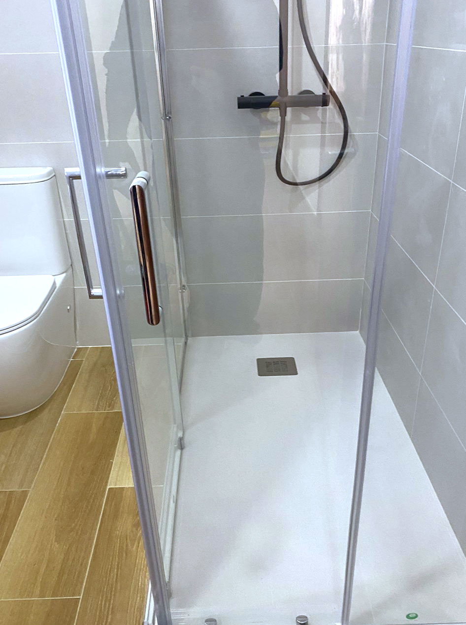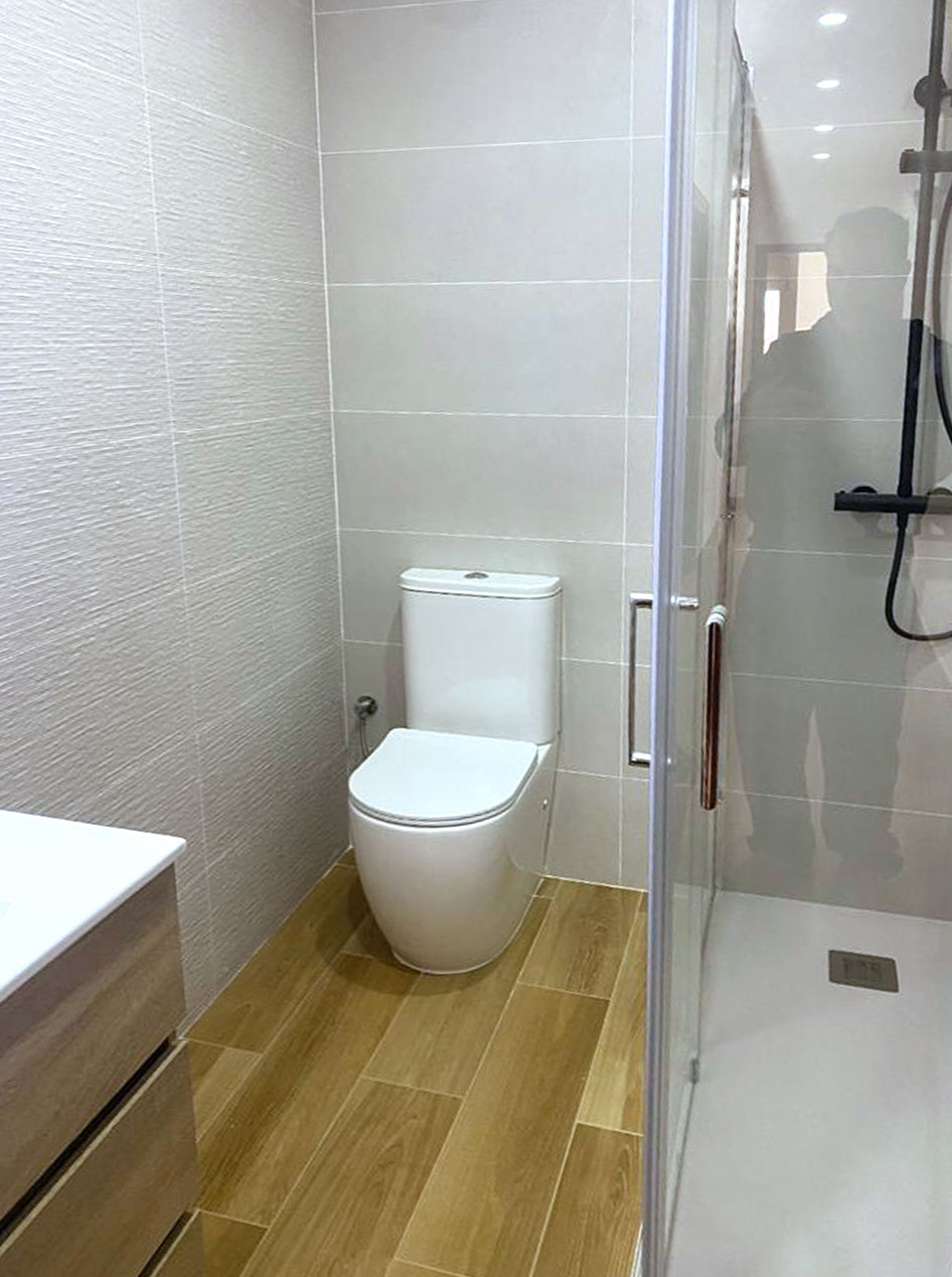 En el baño, instalamos suelos de gres porcelánico imitación madera, azulejos grises de formato medio en paredes y una ducha de gran formato con mampara de apertura en vértice. También colocamos nuevos sanitarios y grifería, creando un espacio cómodo, actual y funcional.